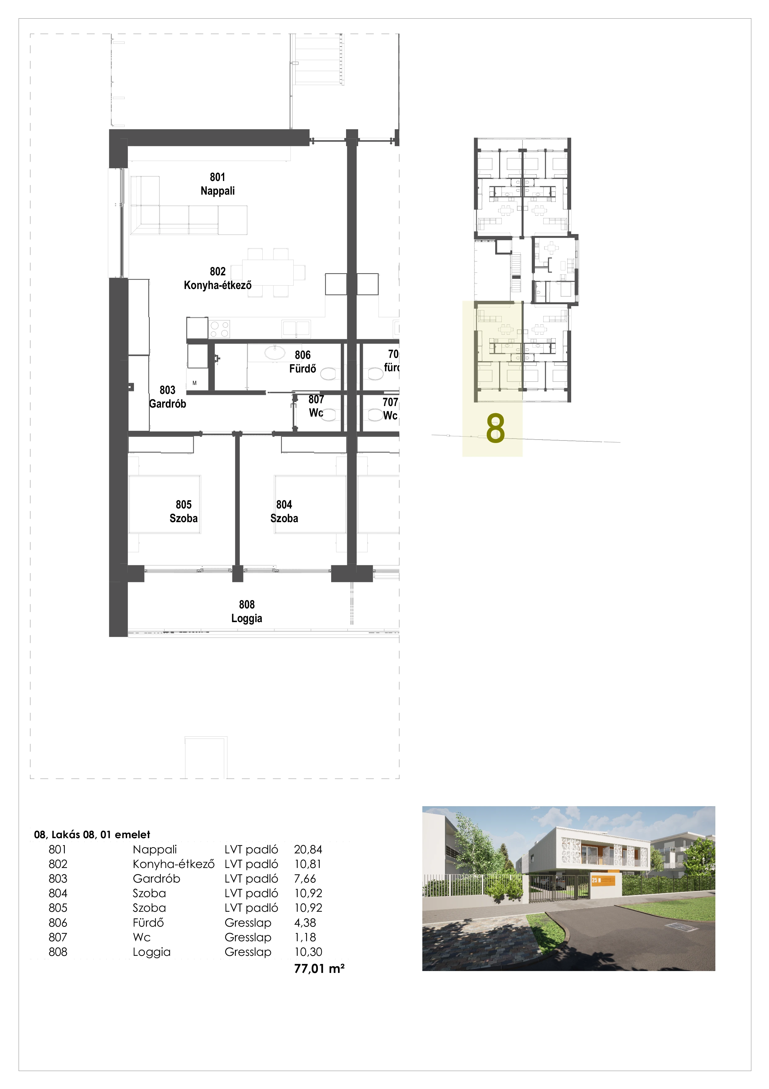 Ez a kifinomult, első emeleti, két szobás lakás tökéletes harmóniát teremt a tágas terek és a praktikus elrendezés között. A modern, egybenyitott nappali-konyha-étkező tér bőséges természetes fényt kap, amely tovább fokozza az otthon világos és barátságos atmoszféráját. A letisztult vonalvezetésű konyha elegáns kialakításával tökéletes helyszíne a közös étkezéseknek és a meghitt pillanatoknak.